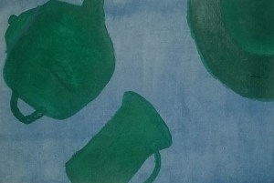 Painting of tea pot, cup and saucer in different positions.
